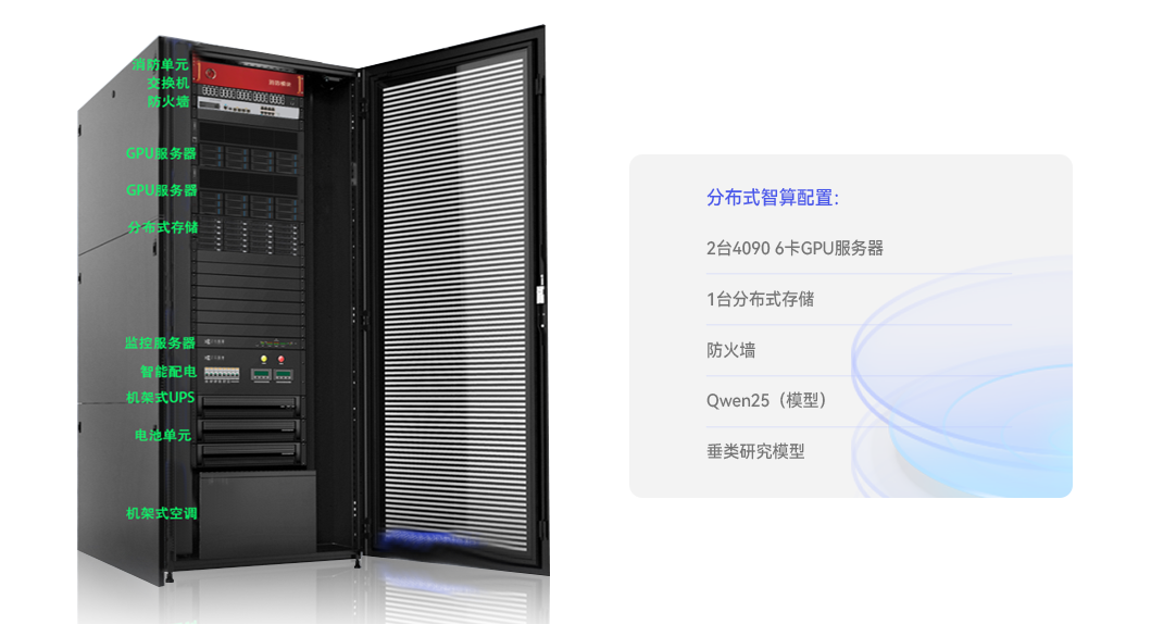 · 采用含机柜及垂类应用的分布式式智算,无需专业机房环境;现场部署时间不到2天;