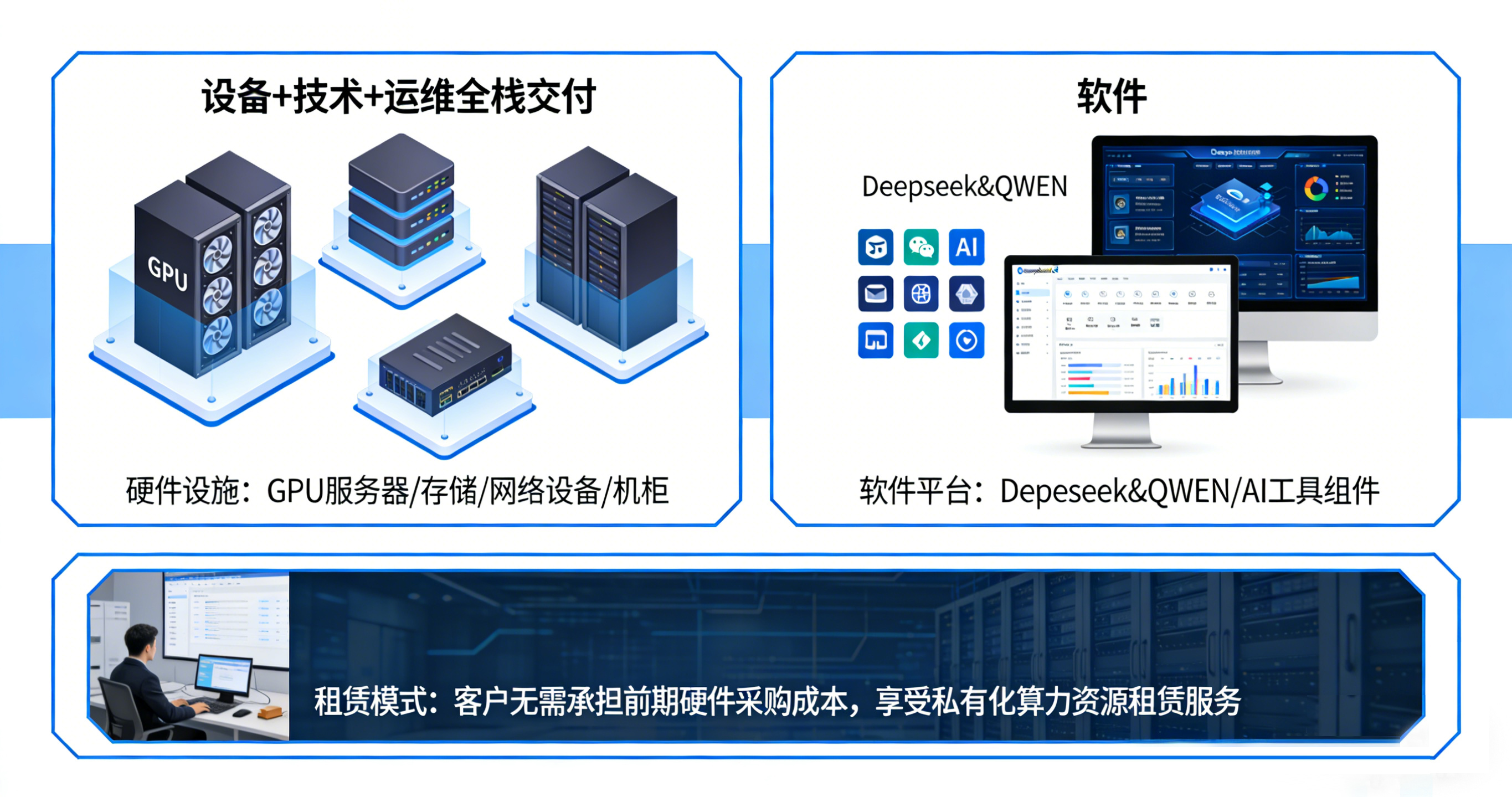 轻资产运营: 客户无需一次性巨额采购投入,将固定资本支出转化为灵活的经营支出,降低财务风险。 数据主权与安全: 所有计算和数据存储均在客户本地物理边界内完成,完全满足一些行业对数据不出域、隐私合规的严格要求。 弹性伸缩与敏捷交付: 可根据项目周期灵活调整租赁规模和时长,设备快速上架,业务上线周期从数周缩短至数天。 技术无忧: 由专业团队负责底层硬件维护和软件栈优化,客户团队可专注于核心算法与业务逻辑,降低运维门槛。 |